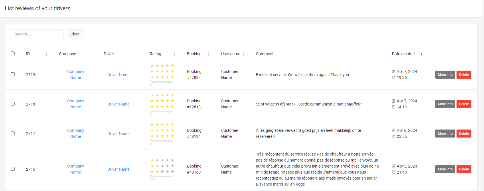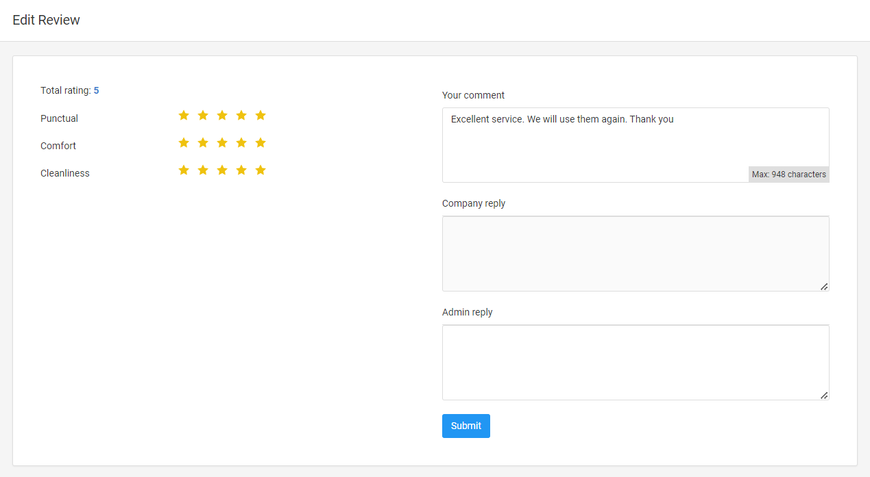 **Company Reply** — In case of a negative review, the taxi company can comment on the situation and explain why the review was negative. The company's comment is only visible to the system administrator, not to the customer. After the company submits their reply, the system administrator will receive an email notification.