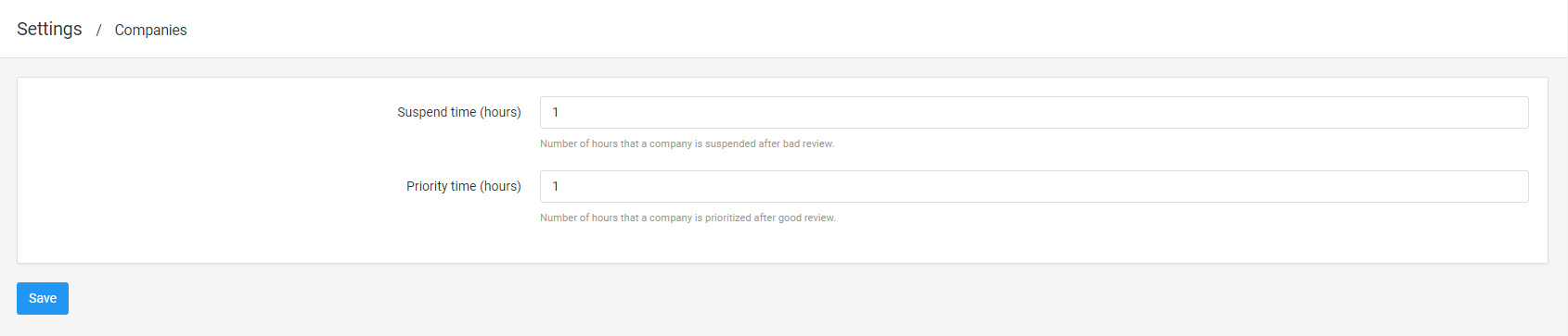Additionally, in the main system settings (**Settings -> Companies**), you can configure an automatic penalty system for taxi companies for a negative review or rewards for a positive review.